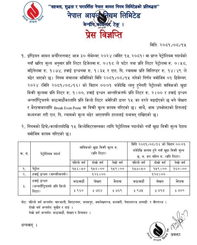 नेपाल आयल निगमले आजबाट लागु हुनेगरी पेट्रोलमा १ रुपैयाँ, हवाई इन्धन (आन्तरिक) मा २ रुपैयाँ र हवाइ इन्धन (अन्तर्राष्ट्रिय) प्रति किलोलिटर काठमाडौंमा १५, पोखरामा ३४ र भैरहवामा ३३ अमेरिकी डलरले वृद्धि गरेको छ ।