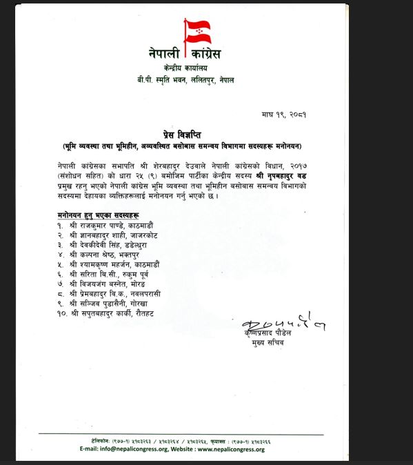 नेपाली कांग्रेसका सभापति श्री शेरबहादुर देउवाले नेपाली कांग्रेसको विधान, २०१७ (संशोधन सहित) को धारा २५ (९) बमोजिम पार्टीका केन्द्रीय सदस्य श्री नृपबहादुर वड प्रमुख रहेको भूमि व्यवस्था तथा भूमिहीन बसोबास समन्वय विभागको सदस्यमा १० जनालाई मनोनयन गरेका हुन ।
