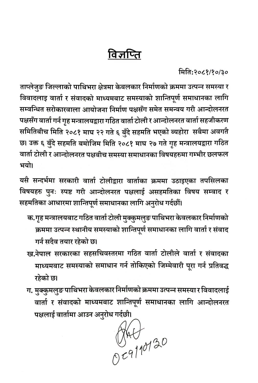 काठमाडौं / गृह मन्त्रालयले ताप्लेजुङको पाथीभरा मुक्कुमलुङस्थित ‘नो केबलकार’ आन्दोलनरत् पक्षलाई पुन: वार्तामा आउन आह्वान गरेको छ।