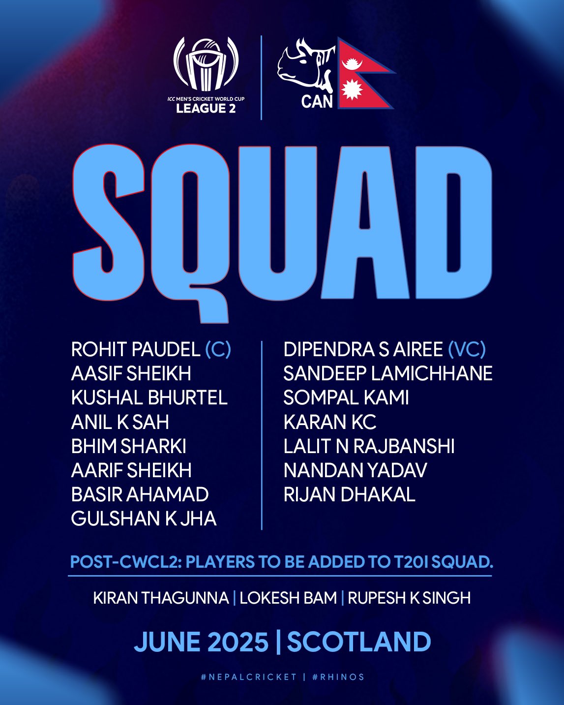 काठमाडौं / आइसीसी क्रिकेट विश्वकप लिग–२ अन्तर्गत स्कटल्याण्ड भ्रमणका लागि नेपाली राष्ट्रिय क्रिकेट टोलीको १५ सदस्यीय टोली घोषणा गरिएको छ । नवनियुक्त प्रशिक्षक स्टुआर्ट लले रोहित पौडेलको कप्तानीमा स्कटल्याण्डका लागि टोली घोषणा गरेका हुन् ।