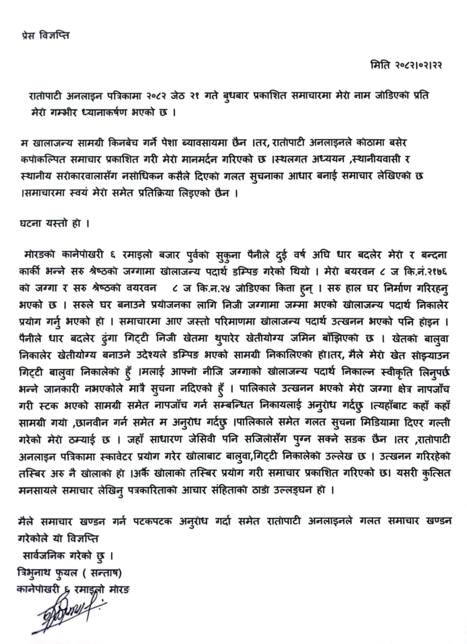विज्ञप्तिमा उक्त स्थानसम्म सजिलै जेसीभी समेत पुग्न नसक्ने अवस्थाको सडक भएको बताउँदै स्काभेटर प्रयोग गरेर खोलाबाट सीधै बालुवा गिट्टी निकालिएको दाबी निराधार भएको उल्लेख छ। उनले समाचारमा प्रयोग गरिएका तस्बिरहरू समेत अर्कै खोलाका भएको दावी गरेका छन् । “यसरी कुत्सित मनसायले समाचार लेखिनु पत्रकारिताको आचारसंहिता विपरीत हो,” विज्ञप्तिमा भनिएको छ।