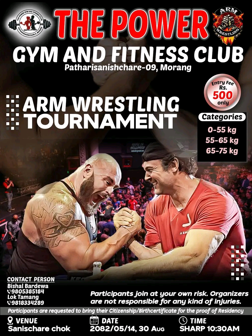 पथरी / मोरङको पथरीशनिश्चरे पहिलो पटक आर्म रेष्टलिङ (पञ्जा लडाइ) प्रतियोगिता हुने भएको छ । द पावर जिम एण्ड फिटनेस क्लबको आयोजनामा भदौ १४ गते शनिबार हुने प्रतियोगितामा तीन तौल समूहका प्रतिस्पर्धीले शक्ति र सीपको प्रदर्शन गर्नेछन् ।