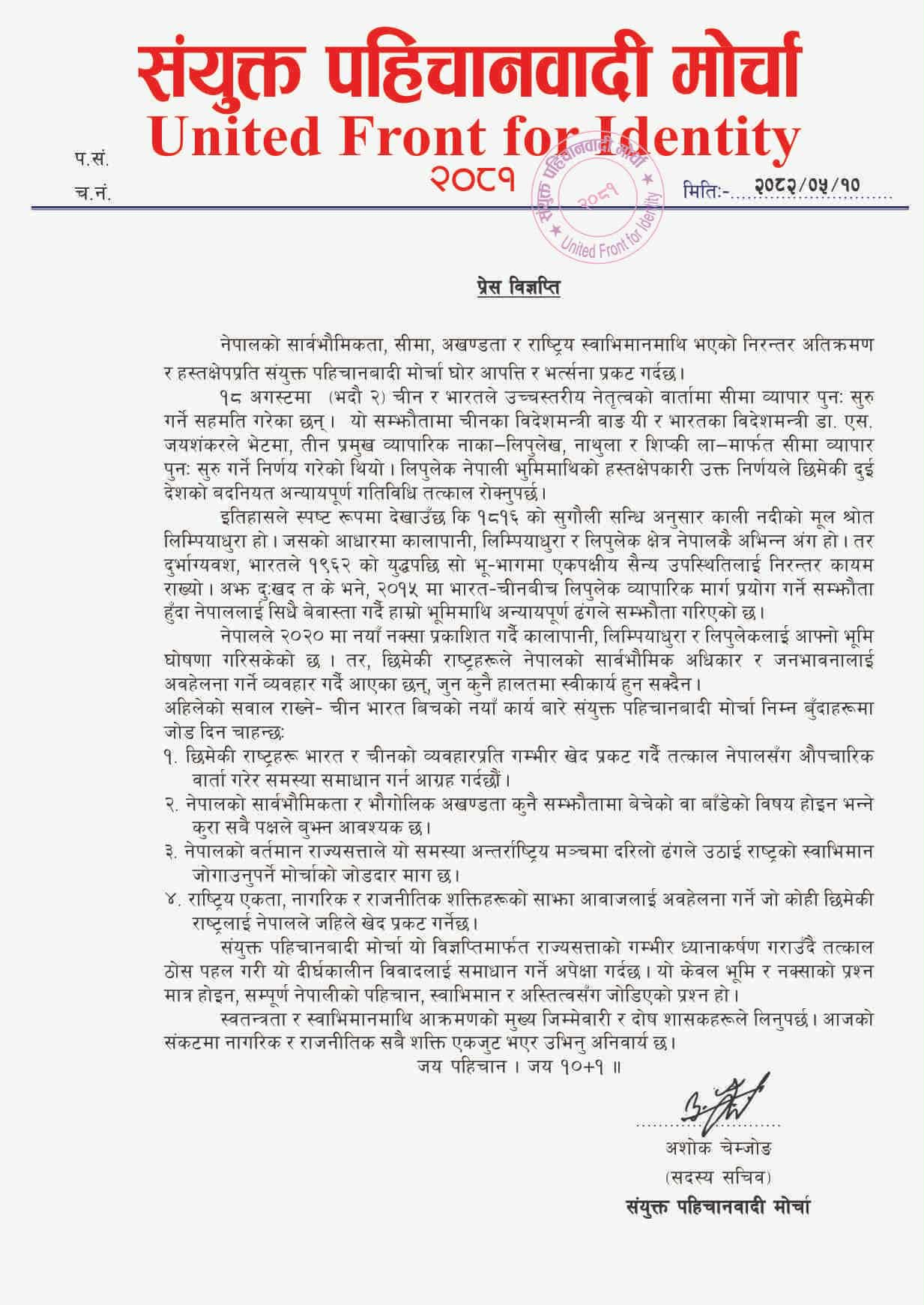 काठमाडौँ / नेपालमाथि भइरहेका अतिक्रमण र हस्तक्षेपका घटनाप्रति संयुक्त पहिचानबादी मोर्चाले घोर आपत्ति जनाएको छ। भदौ २ (अगस्ट १८) मा चीनका विदेशमन्त्री वाङ यी र भारतका विदेशमन्त्री डा. एस. जयशंकरबीच भएको उच्चस्तरीय भेटमा लिपुलेक, नाथुला र शिप्कीला नाकाबाट सीमा व्यापार पुनः सुरु गर्ने निर्णय भएको थियो। नेपाललाई समेट्नै नभएको उक्त सहमतिलाई मोर्चाले प्रत्यक्ष हस्तक्षेप र अस्वीकार्य कदमको संज्ञा दिएको छ।