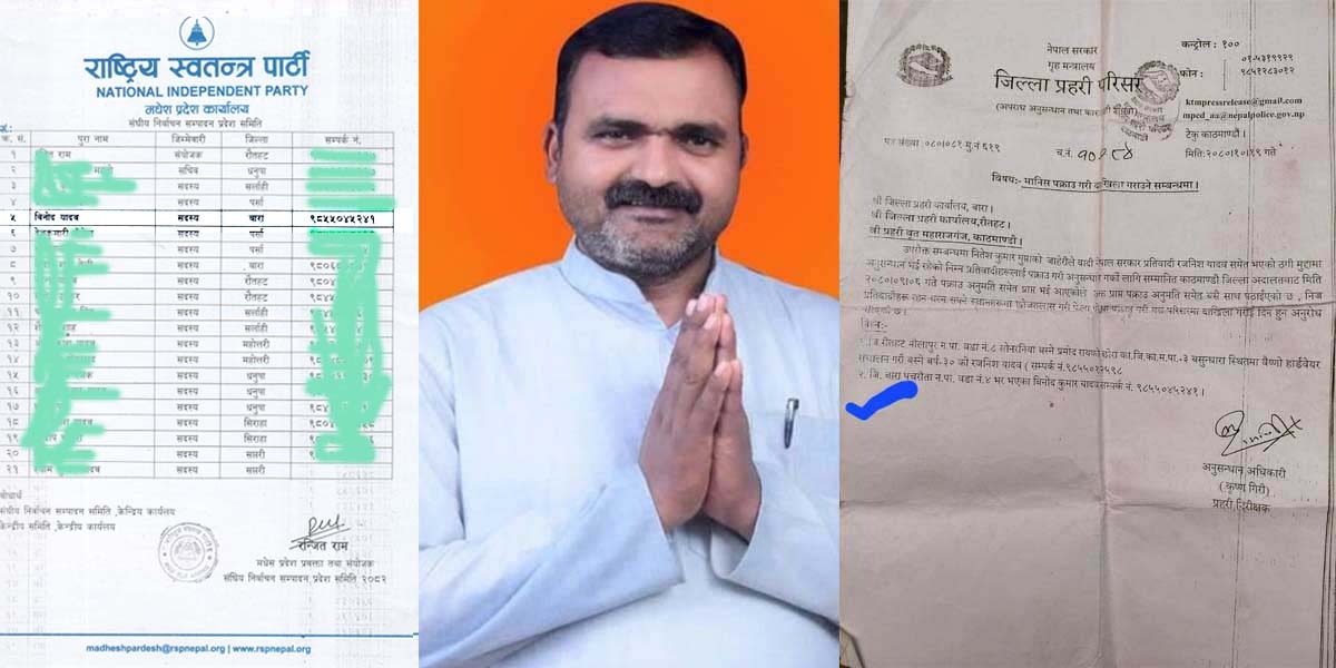 जिल्ला प्रहरी परिसर टेकु काठमाडौँले बारा जिल्ला पचरौता नगरपालिका वडा नं ४ का स्थानीय विनोदकुमार यादवलाई ठगी मुद्दामा पक्राउ गरी अदालतमा हाजिर गराइसकेको अवस्थामा मधेस प्रदेश निर्वाचन समितिको सदस्यमा जिम्मेवारी दिएपछि विवाद उत्पन्न भएको हो ।