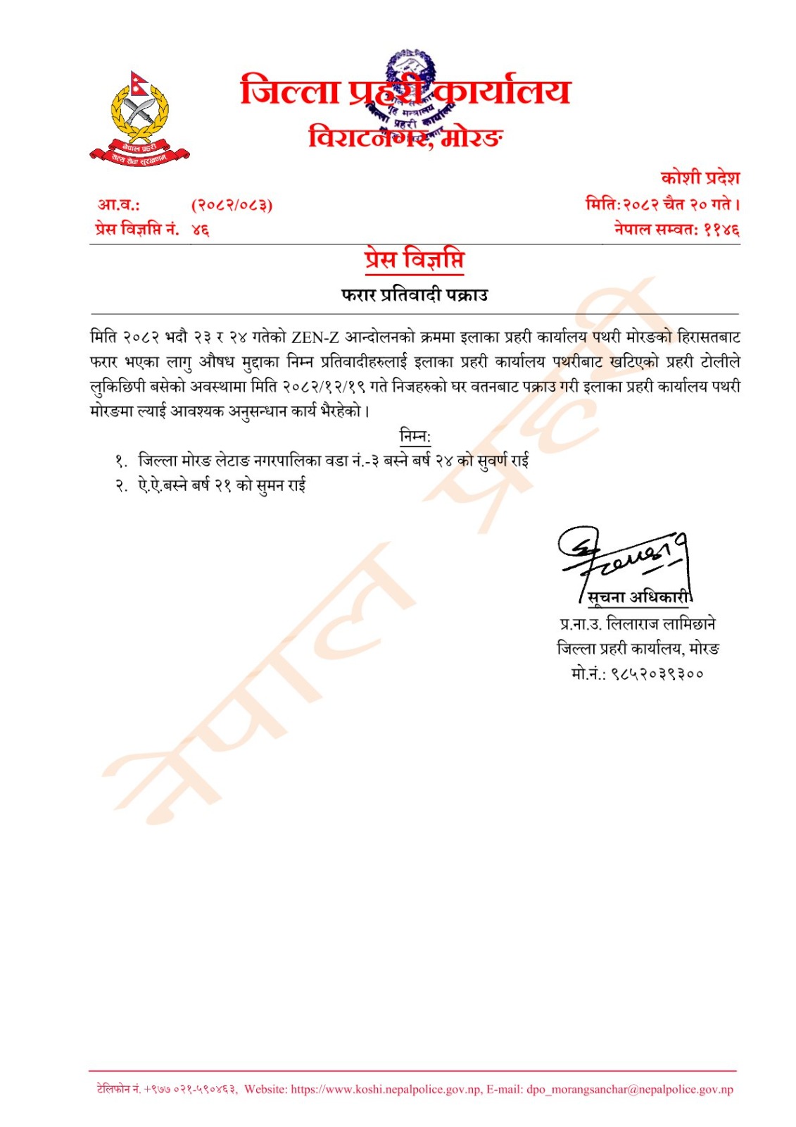 पथरी / मोरङ प्रहरीले जेन्जि न्दोलनका क्रममा फरार रहेका लागूऔषध मुद्दाका दुई प्रतिवादीलाई पक्राउ गरेको जनाएको छ।जिल्ला प्रहरी कार्यालय मोरङले दिएको जानकारीअनुसार, भदौ २३ र २४ गतेको ZEN-Z आन्दोलनका क्रममा इलाका प्रहरी कार्यालय पथरी मोरङको हिरासतबाट फरार भएका दुई जनालाई विशेष प्रहरी टोलीले पक्राउ गरेको हो।