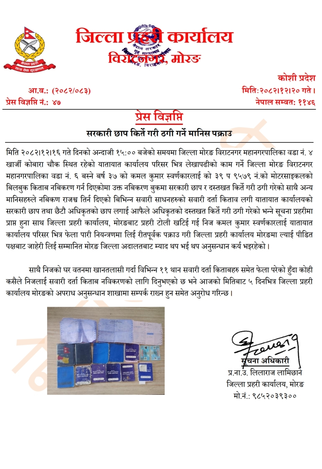यसै क्रममा उनको घर तथा कार्यस्थल खानतलासी गर्दा विभिन्न ११ थान सवारी दर्ता किताबहरू समेत बरामद भएको प्रहरीले जनाएको छ। ती किताबहरू कसैले नवीकरणका लागि दिएको हुन सक्ने आशंकामा प्रहरी कार्यालयले सम्बन्धित व्यक्तिहरूलाई आजको मितिबाट ५ दिनभित्र जिल्ला प्रहरी कार्यालय मोरङको अपराध अनुसन्धान शाखामा सम्पर्क गर्न अनुरोध गरेको छ।